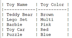 Example: To see the names and colors of all toys, we would use the SQL query: