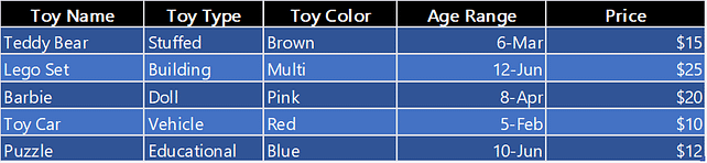 Imagine the “ToyBox” as a special treasure chest where we keep information about different toys organized in rows and columns, just like how we store toys in different boxes within a big treasure chest. Each row in the table represents a specific toy, and each column holds different details about the toy, like its name, type, color, age range, and price.